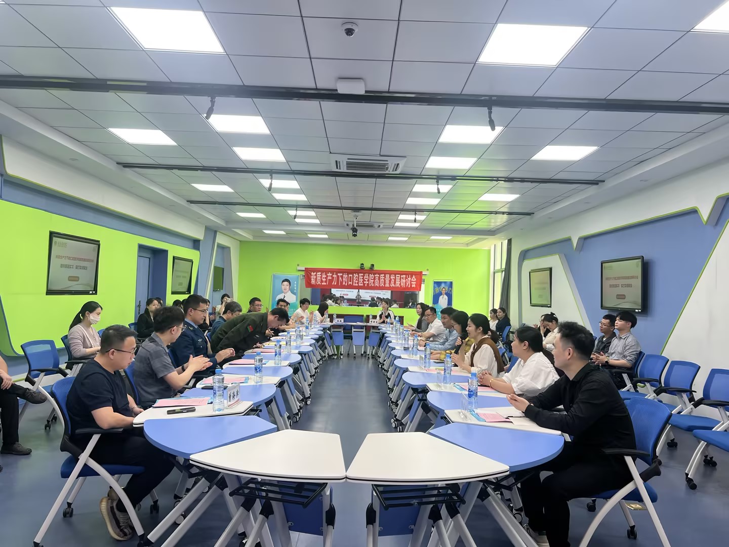 为深入学习贯彻习近平新时代中国特色社会主义思想,有效落实“大力推进现代化产业体系建设,加快发展新质生产力”的指示精神,4月26日,世俱杯官方网站召开“新质生产力下世俱杯官方网站高质量发展”专题研讨会。江西省人民医院口腔科主任刘新庆、联勤保障部队第908医院口腔科主任胡翰青、瑞金雅棋口腔医疗集团等民营机构负责人、世俱杯官方网站全体教师出席会议。