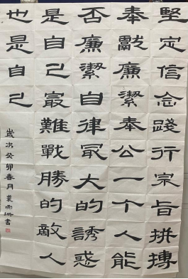 世俱杯官方网站组织学生开展“勤廉书画作品展”“勤廉主题教育黑板报”活动。学生用书法、水墨画、油画、素描等形式,设计出一幅幅主题鲜明、寓意深刻、体现正能量的艺术作品。经评审,本次活动共评出学生作品一等奖1名,二等奖2名,三等奖3名,达到了勤廉文化培根铸魂和文化育人的效果,提高了同学们的勤廉意识,营造校园清明风气。