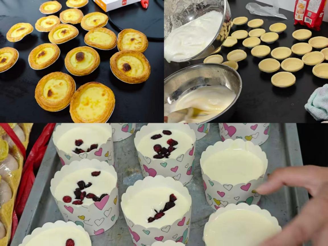 烘焙活动现场暖意融融,学院老师与新生分工协作,揉面团、拌蛋液、塑形烘烤,共同制作酥脆的饼干、绵密香甜的小蛋糕和奶香浓郁的蛋挞。同时,学长学姐进行饮品制作,为大家搭配甜点。