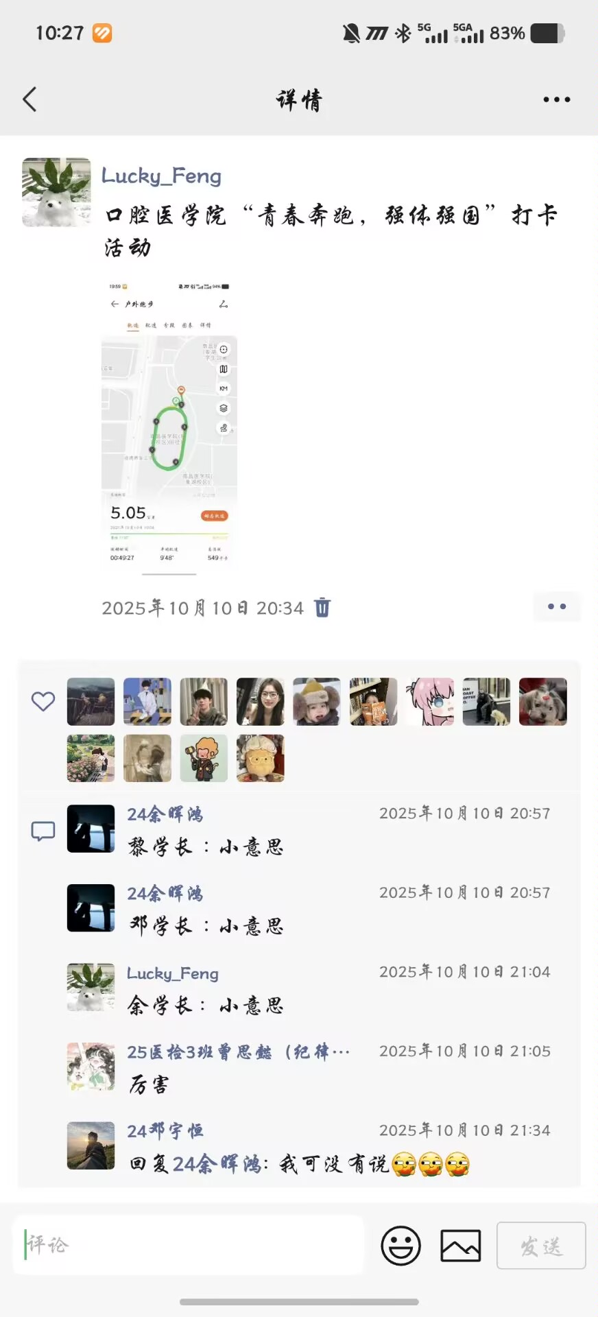 活动得到同学们的积极响应, 600 名同学踊跃报名参与。10 月打卡周期内,同学们既经历过晴空万里的舒适天气,也遭遇过气温骤降、风雨交加的恶劣天气,但所有参与者始终坚守打卡承诺,用坚持诠释运动精神。活动根据累计公里数、配速等情况排序,200 名同学脱颖而出。