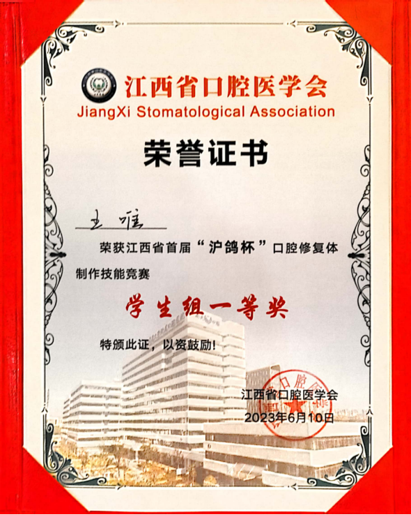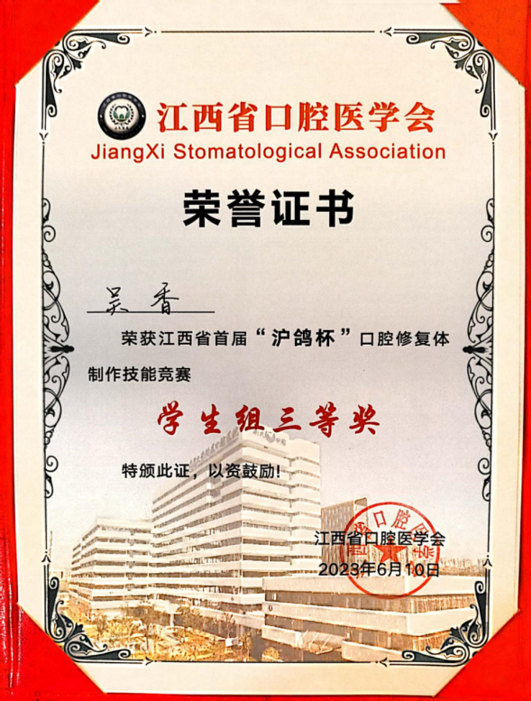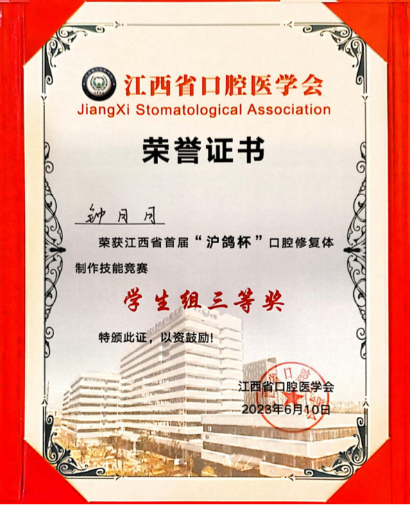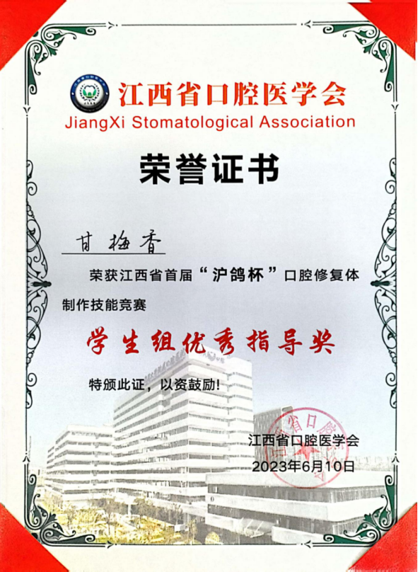 2023年6 月 10 号下午,江西省口腔医学会和江西省口腔修复工艺学专业委员会举办的江西省口腔修复工艺学专委会首届“沪鸽杯”口腔修复体制作技能竞赛在昌举行。大赛吸引了全省开设口腔医学技术(口腔修复工艺技术)专业的中高职、本科院校的师生参加。我院甘梅香老师带队参赛,经过激烈角逐,我院在此次比赛中共斩获学生组一等奖一项、三等奖两项、优秀奖一项和优秀指导老师荣誉一项。