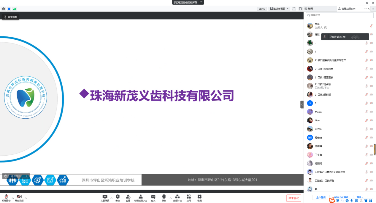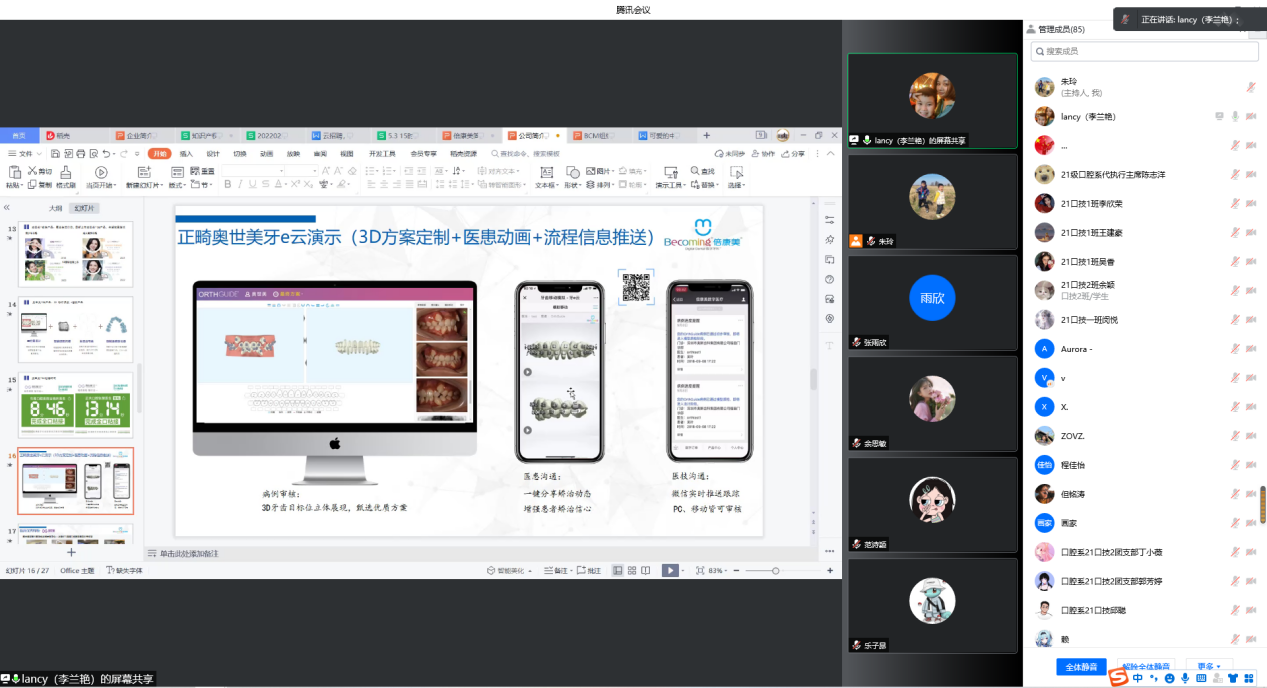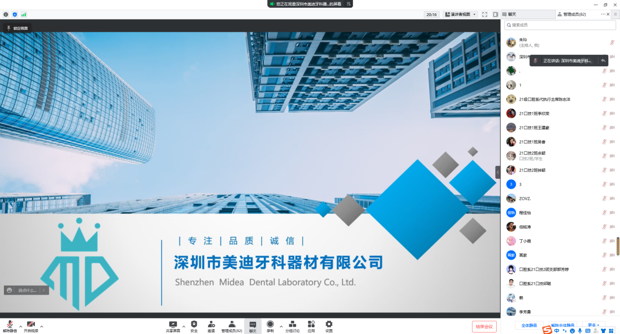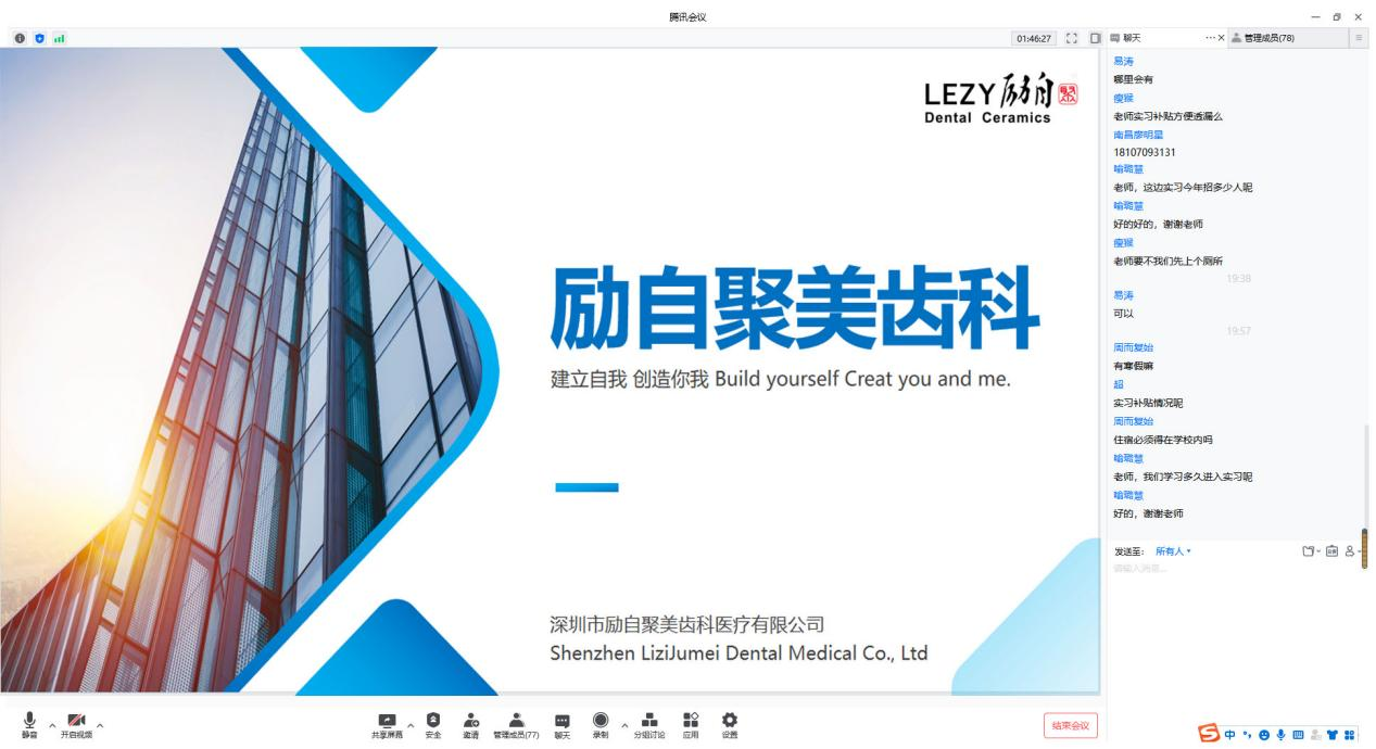 经过筛选,此次宣讲会邀请了深圳市倍康美医疗电子商务有限公司、南昌锦冠桥义齿有限公司、惠州市鲲鹏义齿有限公司、深圳市励自聚美齿科医疗有限公司、深圳市美迪牙科器材有限公司、珠海新茂义齿科技有限公司等六家企业进行线上宣讲,宣讲会利用“腾讯会议”平台进行,各企业宣讲人员热情高涨,准备充分,宣讲过程精彩纷呈,向线上同学全面展示了企业文化与公司概况,以ppt形式向同学介绍了职业发展方向、人才需求、薪资待遇等。同学们也就自己关心的问题与企业进行了热烈的讨论。学院朱玲老师全程在线组织,确保宣讲会流畅、顺利进行。